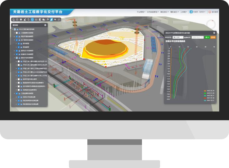 數(shù)字巖土產(chǎn)品的數(shù)字化交付平臺(tái)。基于統(tǒng)一數(shù)據(jù)標(biāo)準(zhǔn),實(shí)現(xiàn)了基于Web端工程勘察信息模型、基坑工程信息模型、樁基工程信息模型、建筑周邊環(huán)境(管線等地下設(shè)施)信息模型、工程監(jiān)測(cè)信息模型等多源巖土工程信息模型的數(shù)字交付,提供視圖書(shū)簽、拾取查詢、標(biāo)尺標(biāo)注、剖切開(kāi)挖、場(chǎng)景漫游、圖模二三維聯(lián)動(dòng)及動(dòng)態(tài)監(jiān)測(cè)數(shù)據(jù)接入、展示、預(yù)警管理等眾多分析功能。